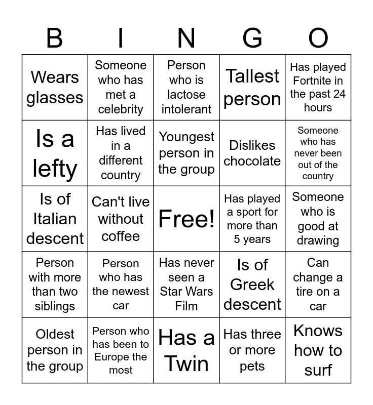 This bingo card has a free space and 24 words: Person who has the newest car, Person who has been to Europe the most, Youngest person in the group, Oldest person in the group, Has played Fortnite in the past 24 hours, Wears glasses, Is a lefty, Someone who has met a celebrity, Has played a sport for more than 5 years, Has never seen a Star Wars Film, Dislikes chocolate, Is of Italian descent, Is of Greek descent, Can change a tire on a car, Has lived in a different country, Has three or more pets, Someone who is good at drawing, Person who is lactose intolerant, Someone who has never been out of the country, Can't live without coffee, Knows how to surf, Person with more than two siblings, Tallest person and Has a Twin.