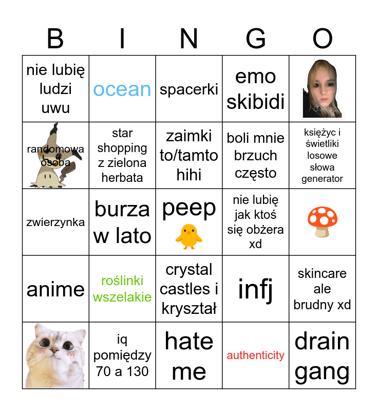This bingo card has 3 images, a free space and 22 words: roślinki wszelakie, iq pomiędzy 70 a 130, zaimki to/tamto hihi, nie lubię ludzi uwu, randomowa osoba, ocean, nie lubię jak ktoś się obżera xd, crystal castles i kryształ, boli mnie brzuch często, zwierzynka, infj, skincare ale brudny xd, star shopping z zielona herbata, authenticity, 🍄, spacerki, księżyc i świetliki losowe słowa generator, burza w lato, drain gang, anime, emo skibidi and hate me.