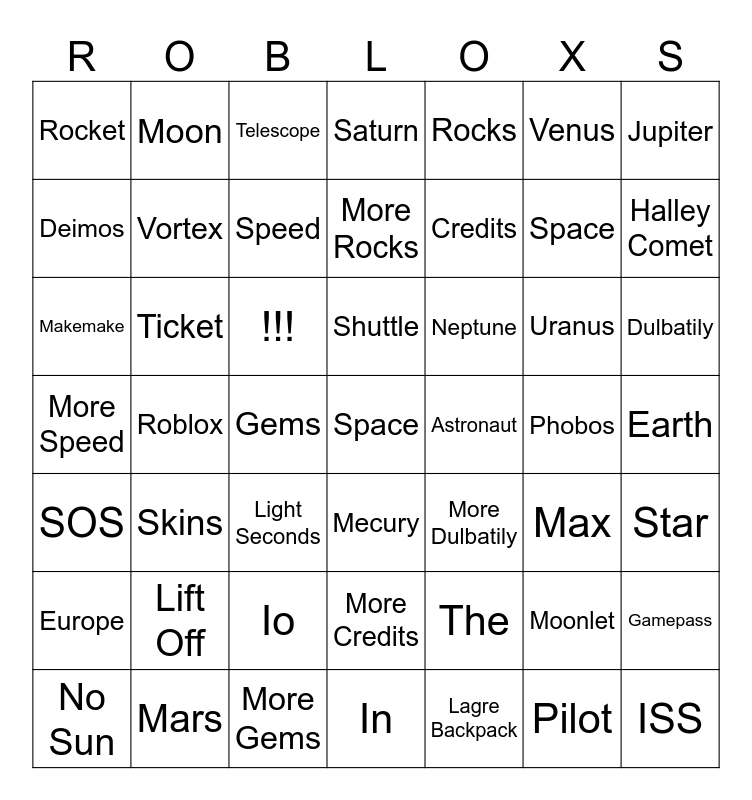 This bingo card has a free space and 48 words: The, Space, In, Roblox, !!!, Earth, Moon, Mars, Venus, Mecury, Jupiter, Saturn, Uranus, Neptune, Europe, Phobos, Deimos, Halley Comet, Moonlet, Rocks, Credits, Gems, Rocket, Vortex, Gamepass, Speed, Dulbatily, No Sun, Shuttle, Ticket, Pilot, Astronaut, Star, Lift Off, More Speed, More Dulbatily, Max, Makemake, Light Seconds, Io, SOS, ISS, Telescope, More Gems, More Rocks, More Credits, Skins and Lagre Backpack.