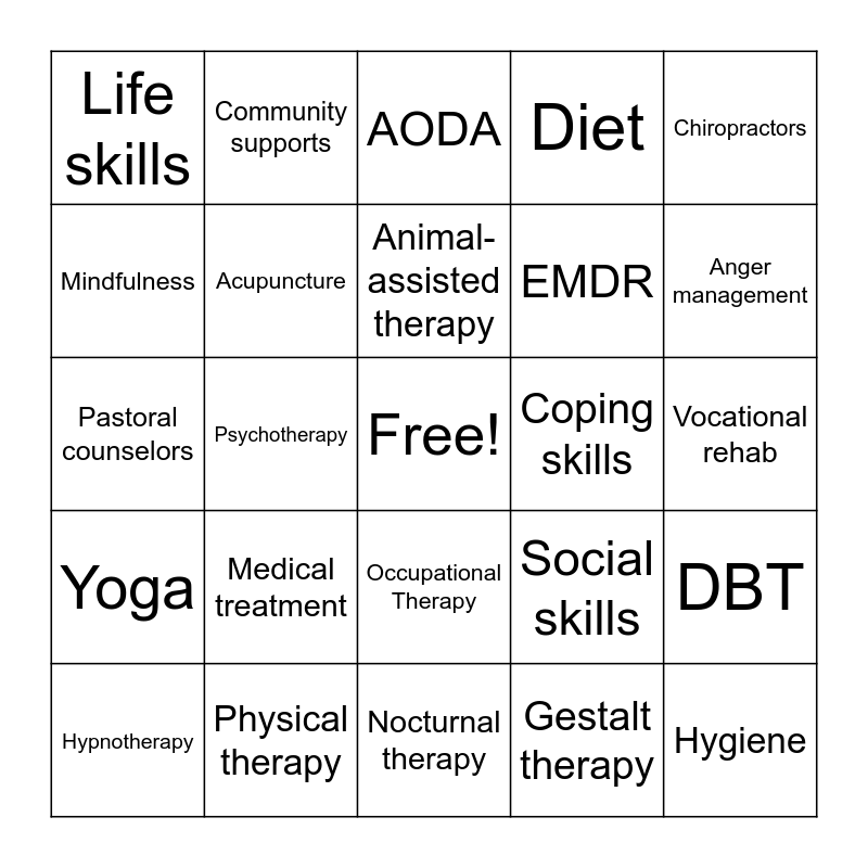 This bingo card has a free space and 34 words: Sensory interventions, Gestalt therapy, Nature, Meditation, Yoga, Acupuncture, Chiropractors, Hypnotherapy, Community supports, Hippotherapy, Animal-assisted therapy, AODA, Support groups, Psychodynamic therapy, Coping skills, Anger management, Physical therapy, Pastoral counselors, Medical treatment, Social skills, Occupational Therapy, Grief counseling, Life skills, Vocational rehab, Nocturnal therapy, Hygiene, Diet, Calisthenics, EMDR, Mindfulness, Medications, Psychotherapy, DBT and CBT.