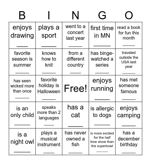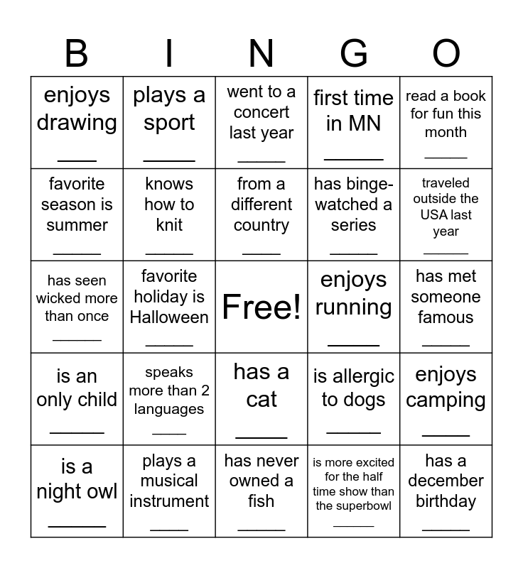 This bingo card has a free space and 24 words: speaks more than 2 languages ____, plays a musical instrument ____, from a different country ____, is a night owl _____, read a book for fun this month _____, enjoys drawing ___, favorite season is summer _____, plays a sport ____, enjoys running ____, has a cat ____, has binge-watched a series _____, has seen wicked more than once ______, is allergic to dogs _____, enjoys camping ____, knows how to knit _____, is more excited for the half time show than the superbowl ______, has met someone famous _____, went to a concert last year _____, traveled outside the USA last year ______, favorite holiday is Halloween _____, has a december birthday _____, is an only child _____, first time in MN _____ and has never owned a fish _____.