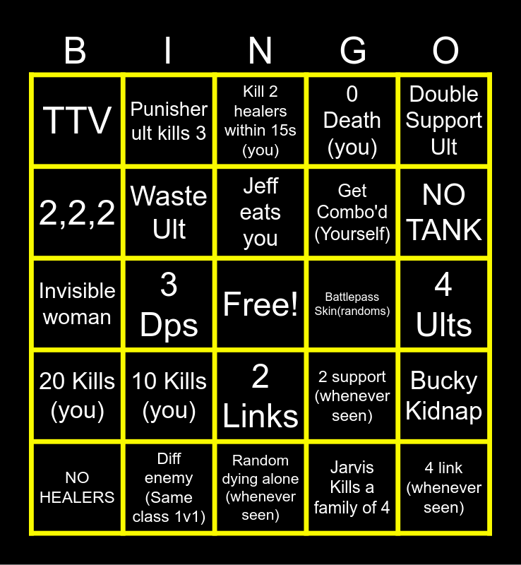 This bingo card has a free space and 63 words: 1v1 Win, 1v1 Lose, Wolve Kidnap, Bucky Kidnap, AGAIN, Win, Punisher ult kills 3, Spiderman, Jeff eats you, Lose, 2 Links, Starlord ult kills 3, 4 Ults, Double Support Ult, Rocket, 2,2,2, 3 Dps, TTV, Toxic Randoms, Get Combo'd (Yourself), 10 Kills (you), 20 Kills (you), 0 Death (you), ACE, MVP, C9, Neg KDA (you), NEG KDA (teammate), "cheater" "reported", Blood (red), Crip (Blue), Cracker (white), Monkey (black), 10K Heals (you), NO TANK, NO HEALERS, Flanked, Jarvis Kills a family of 4, 4 kills without dying (you), Waste Ult, Invisible woman, Battlepass Skin(randoms), Bought skin (randoms), 3 link (whenever seen), 4 link (whenever seen), Diff enemy (Same class 1v1), 1 (whenever seen), 2 support (whenever seen), 1 tank (whenever seen), Magento (whenever seen), Dying alone (you), Random dying alone (whenever seen), Mr. Fantastic (whenever seen), Moon Ult kill 4, 2 v 1 (Diff them), Kill 2 healers within 15s (you), Sit on point for 30s (you), Sit on point for 60s (you), Capture a point (you), Save a random, Random says "GG", Random says "(anything) diff" and Mantis (whenever seen).