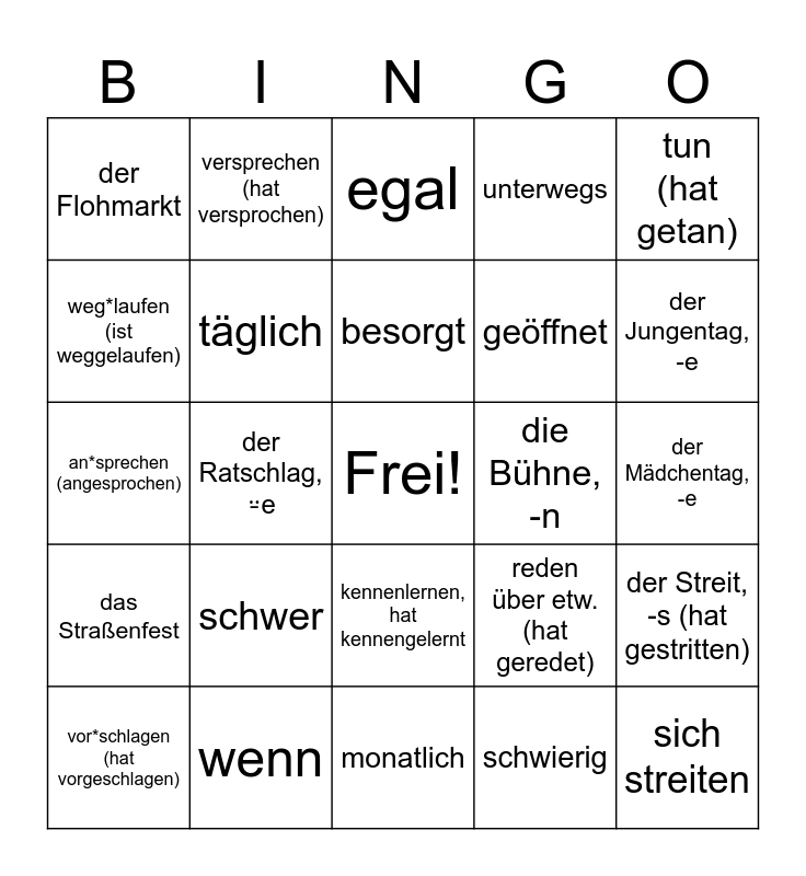 This bingo card has a free space and 42 words: der Ärger, besorgt, deprimiert, schwer, schwierig, der Streit, -s (hat gestritten), sich streiten, dagegen sein, egal, kennenlernen, hat kennengelernt, der Mädchentag, -e, der Jungentag, -e, der Ratschlag, ⸚e, tun (hat getan), sprechen über etw. (hat gesprochen), reden über etw. (hat geredet), zufällig, an*sprechen (angesprochen), sich verabreden (hat verabredet), versprechen (hat versprochen), weg*laufen (ist weggelaufen), ab (8 Uhr), das Aquarium, der Flohmarkt, füttern (hat gefüttert), das Geld, geöffnet, geschlossen, kostenlos, präsentieren (hat präsentiert), schwitzen (hat geschwitzt), das Straßenfest, täglich, monatlich, jährlich, vor*schlagen (hat vorgeschlagen), wenn, die Bühne, -n, dringend, die Reaktion, unterwegs and vorbei.