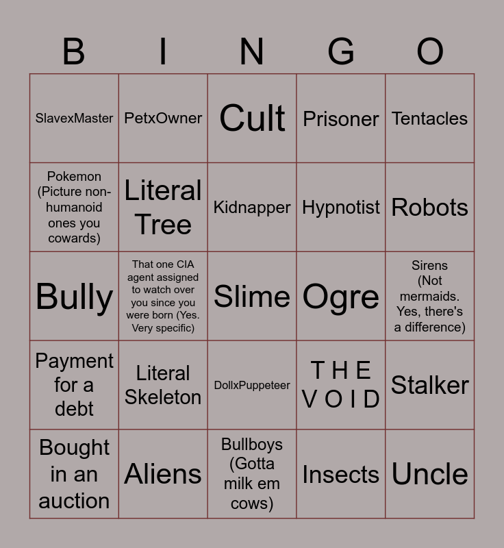 This bingo card has 25 words: Literal Skeleton, Bullboys (Gotta milk em cows), Kidnapper, Bought in an auction, Tentacles, SlavexMaster, Pokemon (Picture non-humanoid ones you cowards), PetxOwner, Ogre, DollxPuppeteer, Hypnotist, Bully, T H E V O I D, Stalker, Literal Tree, Uncle, Sirens (Not mermaids. Yes, there's a difference), Cult, Robots, That one CIA agent assigned to watch over you since you were born (Yes. Very specific), Slime, Aliens, Payment for a debt, Prisoner and Insects.