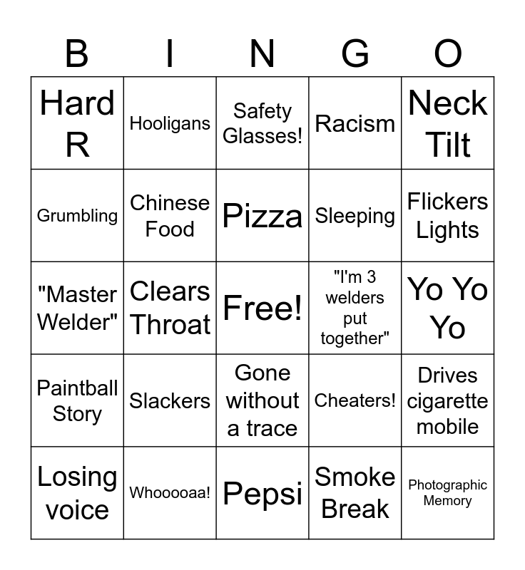 This bingo card has a free space and 24 words: Slackers, Whooooaa!, Pizza, Losing voice, Neck Tilt, Hard R, Grumbling, Hooligans, "I'm 3 welders put together", Gone without a trace, Sleeping, "Master Welder", Cheaters!, Drives cigarette mobile, Chinese Food, Smoke Break, Yo Yo Yo, Safety Glasses!, Flickers Lights, Clears Throat, Photographic Memory, Paintball Story, Racism and Pepsi.