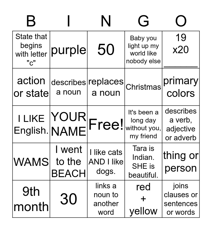 This bingo card has a free space and 24 words: I went to the BEACH, 30, replaces a noun, 9th month, 19 x20 ______, State that begins with letter "c", action or state, purple, It's been a long day without you, my friend, I like cats AND I like dogs., Christmas, I LIKE English., Tara is Indian. SHE is beautiful., thing or person, describes a noun, red + yellow, describes a verb, adjective or adverb, 50, primary colors, YOUR NAME, joins clauses or sentences or words, WAMS, Baby you light up my world like nobody else and links a noun to another word.