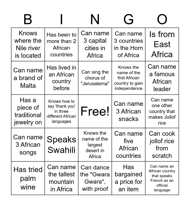 This bingo card has a free space and 24 words: Speaks Swahili, Can name the tallest mountain in Africa, Can sing the chorus of "Jerusalema", Has tried palm wine, Is from East Africa, Knows where the Nile river is located, Can name a brand of Malta, Has been to more than 2 African countries, Can name 3 African snacks, Knows the name of the largest desert in Africa, Knows the name of the first African country to gain independence, Has a piece of traditional jewelry on, Can name five African countries, Can cook jollof rice from scratch, Has lived in an African country before, Has bargained a price for an item, Can name one other country that makes Jollof rice, Can name 3 capital cities in Africa, Can name a famous African leader, Knows how to say 'thank you' in three different African languages, Can name an African country that speaks French as an official language, Can name 3 African songs, Can name 3 countries in the Horn of Africa and Can dance the "Gwara Gwara", with proof.