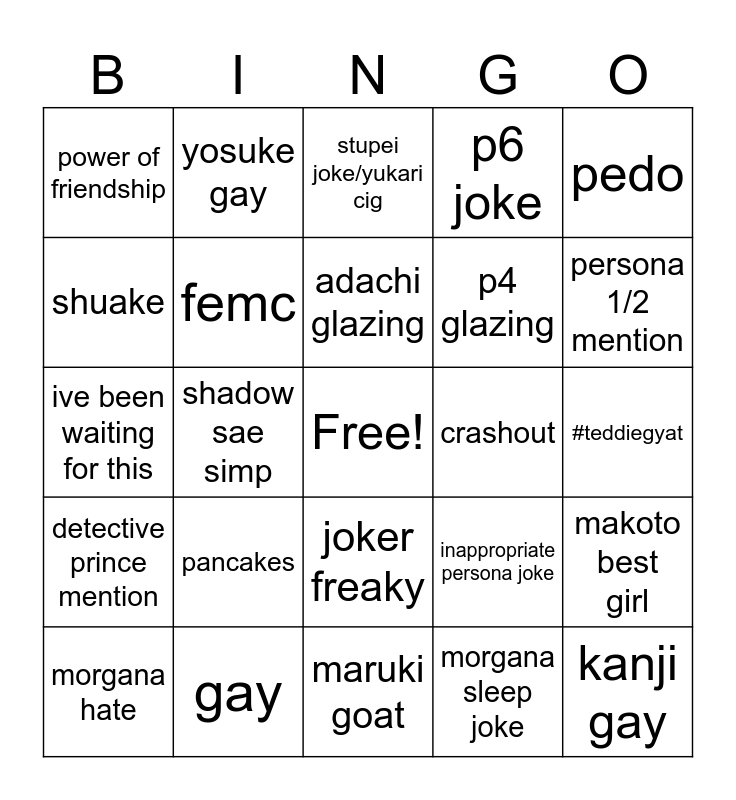 This bingo card has a free space and 24 words: pancakes, gay, adachi glazing, morgana hate, pedo, power of friendship, shuake, yosuke gay, crashout, joker freaky, p4 glazing, ive been waiting for this, inappropriate persona joke, makoto best girl, femc, morgana sleep joke, #teddiegyat, stupei joke/yukari cig, persona 1/2 mention, shadow sae simp, kanji gay, detective prince mention, p6 joke and maruki goat.