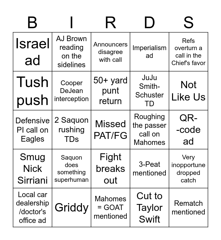 This bingo card has 25 words: Saquon does something superhuman, Mahomes = GOAT mentioned, 50+ yard punt return, Local car dealership /doctor's office ad, Refs overturn a call in the Chief's favor, Israel ad, Tush push, AJ Brown reading on the sidelines, Roughing the passer call on Mahomes, Fight breaks out, JuJu Smith-Schuster TD, Defensive PI call on Eagles, 3-Peat mentioned, Very inopportune dropped catch, Cooper DeJean interception, Rematch mentioned, QR- -code ad, Announcers disagree with call, Not Like Us, 2 Saquon rushing TDs, Missed PAT/FG, Griddy, Smug Nick Sirriani, Imperialism ad and Cut to Taylor Swift.