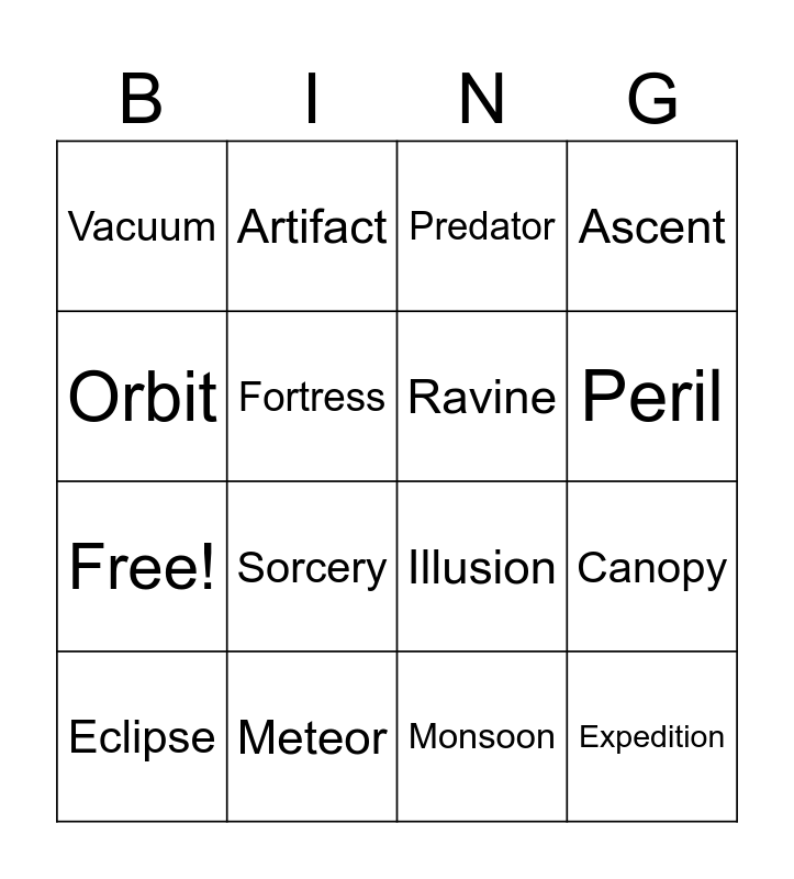 This bingo card has 20 words: Canopy, Serpentine, Predator, Nebula, Eclipse, Orbit, Meteor, Vacuum, Free!, Artifact, Sorcery, Illusion, Fortress, Expedition, Ravine, Compass, Peril, Ascent, Monsoon and Underbush.