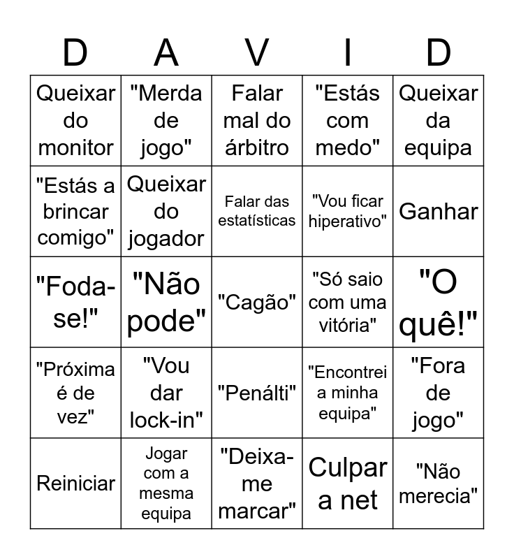 This bingo card has a free space and 33 words: "Que borra", "Roubo", "Não pode", "Foi para Algés", "Próxima é de vez", Queixar do jogador, Queixar da equipa, Reiniciar, "Merda de jogo", "Meu Deus", Falar das estatísticas, Falar mal do árbitro, "Vou-te amassar", Culpar o comando, "Só saio com uma vitória", Ganhar, Jogar com a mesma equipa, "Foda-se!", "Vou dar lock-in", "Encontrei a minha equipa", "Penálti", "Não é possível", Queixar do monitor, "O quê!", "Deixa-me marcar", "Não merecia", "Estás com medo", "Vou ficar hiperativo", "Estás a brincar comigo", "Fora de jogo", "O meu jogo travou", Culpar a net and "Cheirar a cocó".