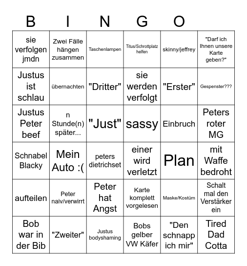 This bingo card has 36 words: Karte komplett vorgelesen, Peter hat Angst, Bobs gelber VW Käfer, Justus ist schlau, Schnabel Blacky, sassy, übernachten, Justus bodyshaming, skinny/jeffrey, Maske/Kostüm, Gespenster???, Titus/Schrottplatz helfen, Schalt mal den Verstärker ein, n Stunde(n) später..., sie werden verfolgt, sie verfolgen jmdn, aufteilen, Einbruch, Justus Peter beef, Taschenlampen, "Just", Mein Auto :(, einer wird verletzt, peters dietrichset, Plan, Zwei Fälle hängen zusammen, "Erster", "Zweiter", "Dritter", "Darf ich Ihnen unsere Karte geben?", Tired Dad Cotta, Bob war in der Bib, mit Waffe bedroht, Peters roter MG, Peter naiv/verwirrt and "Den schnapp ich mir".