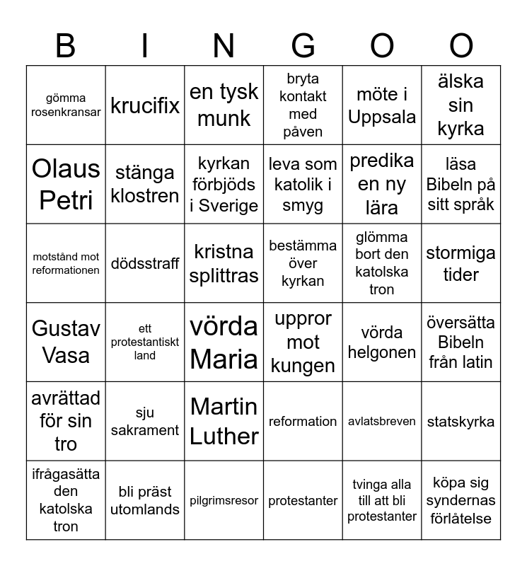 This bingo card has 36 words: reformation, Martin Luther, protestanter, Olaus Petri, Gustav Vasa, bestämma över kyrkan, stänga klostren, pilgrimsresor, möte i Uppsala, avlatsbreven, läsa Bibeln på sitt språk, bryta kontakt med påven, statskyrka, dödsstraff, leva som katolik i smyg, gömma rosenkransar, avrättad för sin tro, glömma bort den katolska tron, motstånd mot reformationen, en tysk munk, kristna splittras, ett protestantiskt land, uppror mot kungen, vörda Maria, vörda helgonen, krucifix, predika en ny lära, bli präst utomlands, kyrkan förbjöds i Sverige, älska sin kyrka, köpa sig syndernas förlåtelse, ifrågasätta den katolska tron, översätta Bibeln från latin, stormiga tider, sju sakrament and tvinga alla till att bli protestanter.