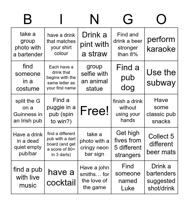 This bingo card has a free space and 24 words: find a different pub with a dart board (and get a score of 80+ in 3 darts), have a cocktail, group selfie with an animal statue, find a pub with live music, perform karaoke, take a group photo with a bartender, find someone in a costume, have a drink that matches your shirt colour, finish a drink without using your hands, take a photo with a cringy neon bar sign, Find a pub dog, split the G on a Guinness in an Irish pub, Get high fives from 5 different strangers, Collect 5 different beer mats, Each have a drink that begins with the same letter as your first name, Find someone named Luke, Have some classic pub snacks, Drink a pint with a straw, Use the subway, Find a puggie in a pub (spin to win?), Drink a bartenders suggested shot/drink, Have a drink in a dead quiet empty pub/bar, Find and drink a beer stronger than 8% and Have a john smiths… for the love of the game.