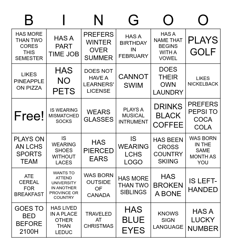 This bingo card has 36 words: HAS MORE THAN TWO SIBLINGS, WAS BORN OUTSIDE OF CANADA, HAS BLUE EYES, LIKES PINEAPPLE ON PIZZA, PLAYS ON AN LCHS SPORTS TEAM, PLAYS A MUSICAL INTRUMENT, HAS NO PETS, TRAVELED AT CHRISTMAS, HAS A NAME THAT BEGINS WITH A VOWEL, HAS BROKEN A BONE, LIKES NICKELBACK, HAS A BIRTHDAY IN FEBRUARY, IS LEFT-HANDED, IS WEARING MISMATCHED SOCKS, CANNOT SWIM, HAS MORE THAN TWO CORES THIS SEMESTER, ATE CEREAL FOR BREAKFAST, DRINKS BLACK COFFEE, Free!, PREFERS WINTER OVER SUMMER, WEARS GLASSES, IS WEARING SHOES WITHOUT LACES, IS WEARING LCHS LOGO, HAS PIERCED EARS, HAS BEEN CROSS COUNTRY SKIING, HAS A PART TIME JOB, DOES THEIR OWN LAUNDRY, HAS LIVED IN A PLACE OTHER THAN LEDUC, DOES NOT HAVE A LEARNERS' LICENSE, PLAYS GOLF, HAS A LUCKY NUMBER, GOES TO BED BEFORE 2100H, WAS BORN IN THE SAME MONTH AS YOU, PREFERS PEPSI TO COCA COLA, WANTS TO ATTEND UNIVERSITY IN ANOTHER PROVINCE OR COUNTRY and KNOWS SIGN LANGUAGE.