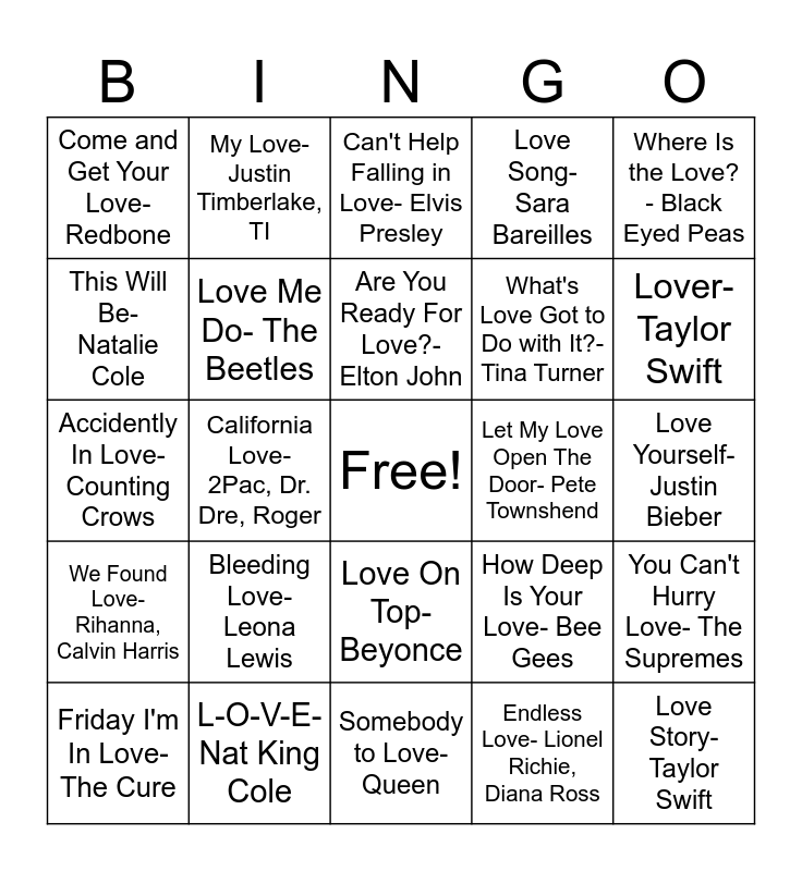 This bingo card has a free space and 31 words: Somebody to Love- Queen, I want to Know What Love Is- Foreigner, California Love- 2Pac, Dr. Dre, Roger, Baby Love- The Supremes, Come and Get Your Love- Redbone, Can't Help Falling in Love- Elvis Presley, Love Me Do- The Beetles, How Deep Is Your Love- Bee Gees, Let My Love Open The Door- Pete Townshend, Endless Love- Lionel Richie, Diana Ross, Love Yourself- Justin Bieber, Love Story- Taylor Swift, Thinking 'Bout Love- Wild Rivers, Lovely Day- Bill Withers, Lover-Taylor Swift, Crazy In Love- Beyonce, Jay-Z, You Can't Hurry Love- The Supremes, Bleeding Love- Leona Lewis, We Found Love- Rihanna, Calvin Harris, Love On Top- Beyonce, Where Is the Love? - Black Eyed Peas, Your Love- The Outfield, Friday I'm In Love- The Cure, My Love- Justin Timberlake, TI, What's Love Got to Do with It?- Tina Turner, This Will Be- Natalie Cole, Love Song- Sara Bareilles, Accidently In Love- Counting Crows, L-O-V-E-Nat King Cole, Are You Ready For Love?- Elton John and Higher Love- Kygo, Whitney Houston.