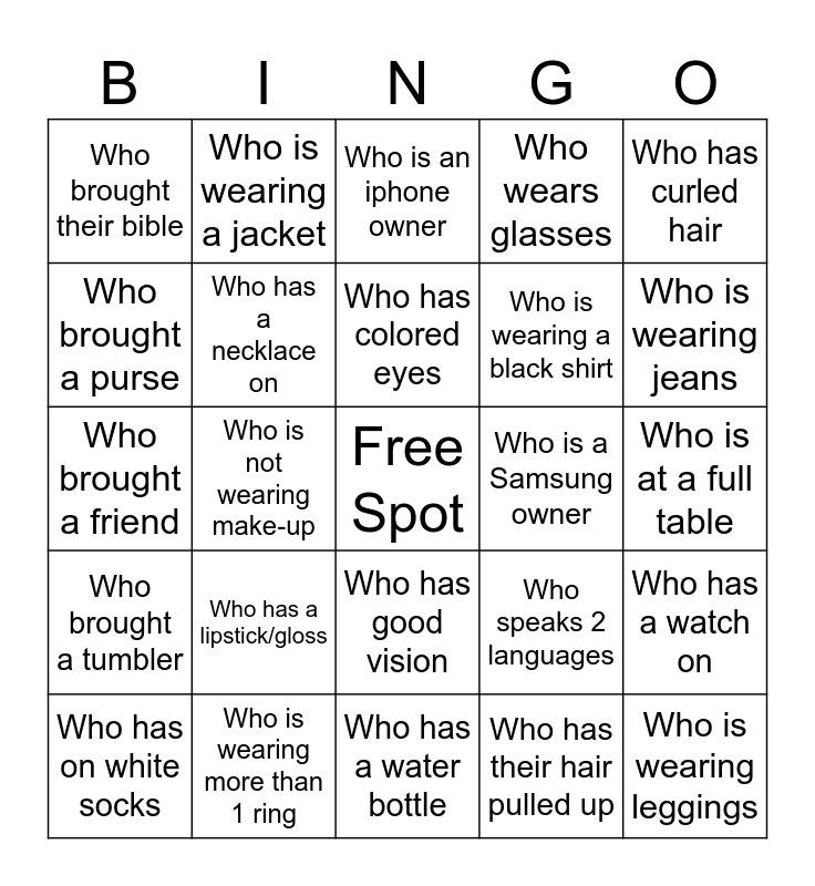 This bingo card has a free space and 24 words: Who has on white socks, Who has a lipstick/gloss, Who has colored eyes, Who has their hair pulled up, Who has curled hair, Who brought their bible, Who is wearing a jacket, Who is an iphone owner, Who is a Samsung owner, Who is at a full table, Who brought a friend, Who has a necklace on, Who speaks 2 languages, Who has a watch on, Who brought a purse, Who is wearing more than 1 ring, Who has a water bottle, Who wears glasses, Who is wearing jeans, Who brought a tumbler, Who is not wearing make-up, Who has good vision, Who is wearing a black shirt and Who is wearing leggings.