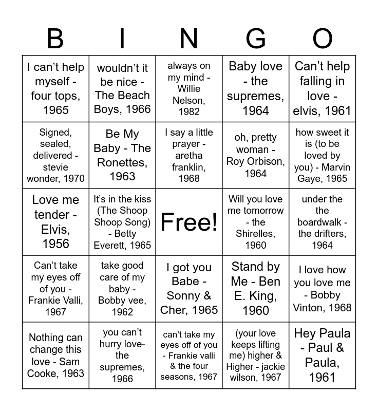 This bingo card has a free space and 35 words: Put your head on my shoulder - Paul Anka, 1963, This will be (an everlasting love) - Natalie Cole, 1975, When a man loves a woman - percy sledge, 1966, Be My Baby - The Ronettes, 1963, I got you Babe - Sonny & Cher, 1965, Baby love - the supremes, 1964, Signed, sealed, delivered - stevie wonder, 1970, Chapel of love - the dixie cups, 1964, I say a little prayer - aretha franklin, 1968, L - O - V - E - Nat King Cole, 1965, Love me tender - Elvis, 1956, Can’t help falling in love - elvis, 1961, My girl - the temptations, 1965, At last - Etta James. 1960, I can’t help myself - four tops, 1965, Will you love me tomorrow - the Shirelles, 1960, (your love keeps lifting me) higher & Higher - jackie wilson, 1967, It’s in the kiss (The Shoop Shoop Song) - Betty Everett, 1965, Can’t take my eyes off of you - Frankie Valli, 1967, Hey Paula - Paul & Paula, 1961, Stand by Me - Ben E. King, 1960, Nothing can change this love - Sam Cooke, 1963, I love how you love me - Bobby Vinton, 1968, you can’t hurry love- the supremes, 1966, always on my mind - Willie Nelson, 1982, how sweet it is (to be loved by you) - Marvin Gaye, 1965, we belong together - Ritchie valens, 1955, all I have to do is dream - the everly brothers, 1958, oh, pretty woman - Roy Orbison, 1964, under the the boardwalk - the drifters, 1964, when a man loves a woman - Percy sledge, 1966, can’t take my eyes off of you - Frankie valli & the four seasons, 1967, take good care of my baby - Bobby vee, 1962, wouldn’t it be nice - The Beach Boys, 1966 and sherry - Frankie valli & the four seasons, 1962.