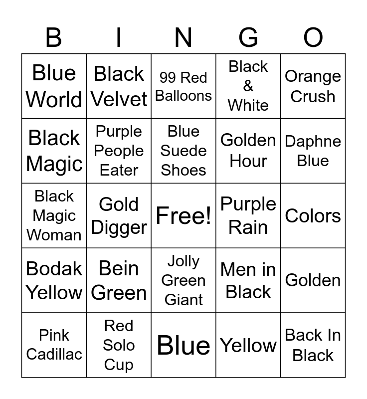 This bingo card has a free space and 34 words: Little Red Corvette, Yellow, Rose Colored Boy, Brown Eyed Girl, Bodak Yellow, Purple People Eater, Orange Crush, Pink Cadillac, Black Velvet, Goodbye Yellow Brick Road, Blue Suede Shoes, 99 Red Balloons, Rudolph the Red-Nose Reindeer, Pink Pony Club, Purple Rain, Daphne Blue, Red Solo Cup, Black Magic Woman, Bein Green, Men in Black, Jolly Green Giant, Pink + White, Blue World, Colors, Blue, Back In Black, Black & White, Raspberry Beret, Golden Hour, Black Magic, Green Light, Gold Digger, Golden and Mr. Blue Sky.