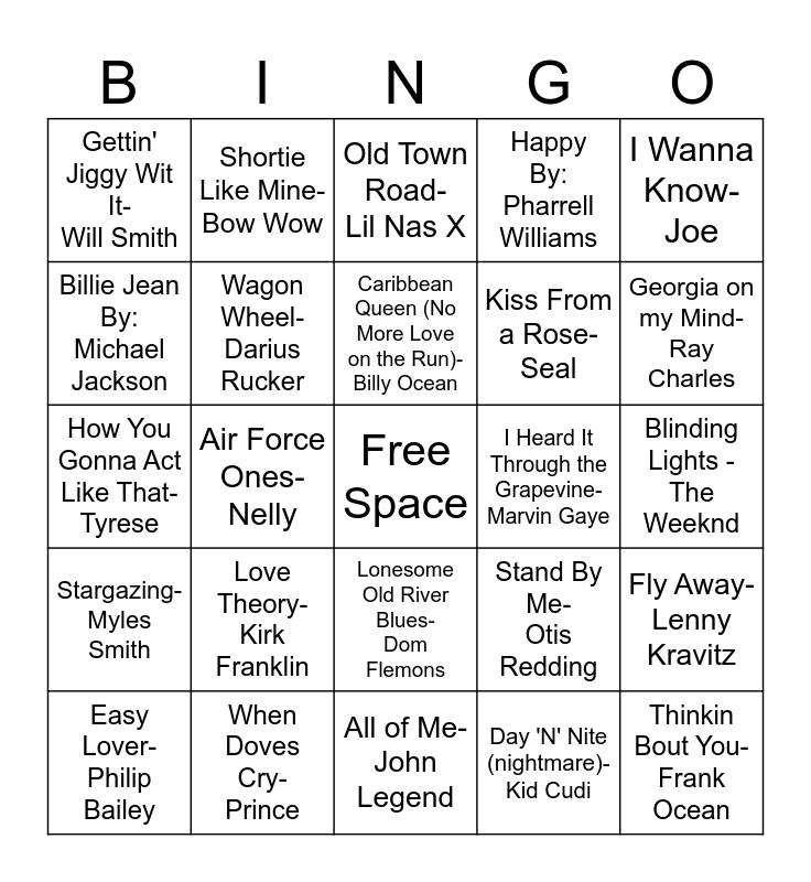 This bingo card has a free space and 30 words: When Doves Cry- Prince, Stand out- Tevin Campbell, Air Force Ones- Nelly, My Boo- Usher, Gettin' Jiggy Wit It- Will Smith, Old Town Road- Lil Nas X, Wagon Wheel- Darius Rucker, Lonesome Old River Blues- Dom Flemons, I Heard It Through the Grapevine- Marvin Gaye, All of Me- John Legend, Blinding Lights -The Weeknd, Thinkin Bout You- Frank Ocean, Day 'N' Nite (nightmare)- Kid Cudi, Let Me Love You- Ne-Yo, Georgia on my Mind- Ray Charles, Signed, Sealed, Delivered (I'm Yours)- Stevie Wonder, Stand By Me- Otis Redding, Stargazing- Myles Smith, Love Theory- Kirk Franklin, I Wanna Know- Joe, How You Gonna Act Like That- Tyrese, Let's Stay Together- Al Green, Shortie Like Mine- Bow Wow, Kiss From a Rose- Seal, Billie Jean By: Michael Jackson, Happy By: Pharrell Williams, Fly Away- Lenny Kravitz, Easy Lover- Philip Bailey, Caribbean Queen (No More Love on the Run)- Billy Ocean and You're the First, the Last, My Everything- Barry White.