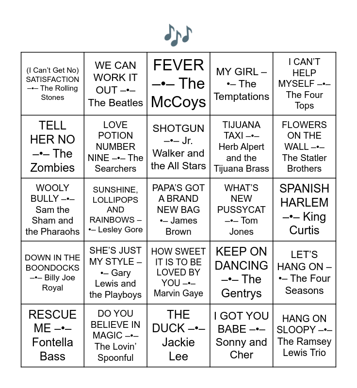 This bingo card has 35 words: DOWNTOWN –•– Petula Clark, YOU’VE LOST THAT LOVIN’ FEELIN’ –•– The Righteous Brothers, THE NAME GAME –•– Shirley Ellis, LOVE POTION NUMBER NINE –•– The Searchers, HOW SWEET IT IS TO BE LOVED BY YOU –•– Marvin Gaye, MY GIRL –•– The Temptations, TELL HER NO –•– The Zombies, ALL DAY AND ALL OF THE NIGHT –•– The Kinks, SHOTGUN –•– Jr. Walker and the All Stars, GAME OF LOVE –•– Wayne Fontana, WOOLY BULLY –•– Sam the Sham and the Pharaohs, I CAN’T HELP MYSELF –•– The Four Tops, HELP ME, RHONDA –•– The Beach Boys, I’M HENRY THE VIII, I AM –•– Herman’s Hermits, (I Can’t Get No) SATISFACTION –•– The Rolling Stones, WHAT’S NEW PUSSYCAT –•– Tom Jones, I GOT YOU BABE –•– Sonny and Cher, SUNSHINE, LOLLIPOPS AND RAINBOWS –•– Lesley Gore, DOWN IN THE BOONDOCKS –•– Billy Joe Royal, PAPA’S GOT A BRAND NEW BAG •– James Brown, KEEP ON DANCING –•– The Gentrys, RESCUE ME –•– Fontella Bass, LET’S HANG ON –•– The Four Seasons, DO YOU BELIEVE IN MAGIC –•– The Lovin’ Spoonful, FEVER –•– The McCoys, FLOWERS ON THE WALL –•– The Statler Brothers, HANG ON SLOOPY –•– The Ramsey Lewis Trio, FIVE O’CLOCK WORLD –•– The Vogues, TIJUANA TAXI –•– Herb Alpert and the Tijuana Brass, SPANISH HARLEM –•– King Curtis, PRINCESS IN RAGS –•– Gene Pitney, THE DUCK –•– Jackie Lee, SHE’S JUST MY STYLE –•– Gary Lewis and the Playboys, WE CAN WORK IT OUT –•– The Beatles and UPTIGHT –•– Stevie Wonder.