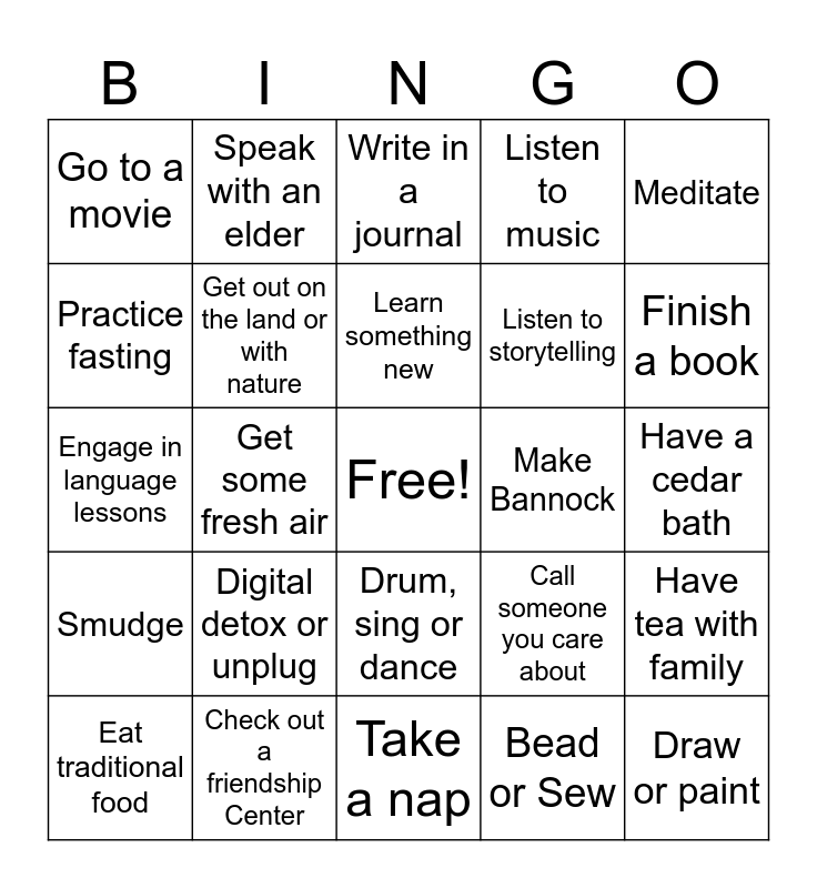 This bingo card has a free space and 24 words: Digital detox or unplug, Check out a friendship Center, Learn something new, Eat traditional food, Meditate, Go to a movie, Practice fasting, Speak with an elder, Make Bannock, Drum, sing or dance, Listen to storytelling, Engage in language lessons, Call someone you care about, Have tea with family, Get out on the land or with nature, Bead or Sew, Have a cedar bath, Write in a journal, Finish a book, Get some fresh air, Draw or paint, Smudge, Listen to music and Take a nap.