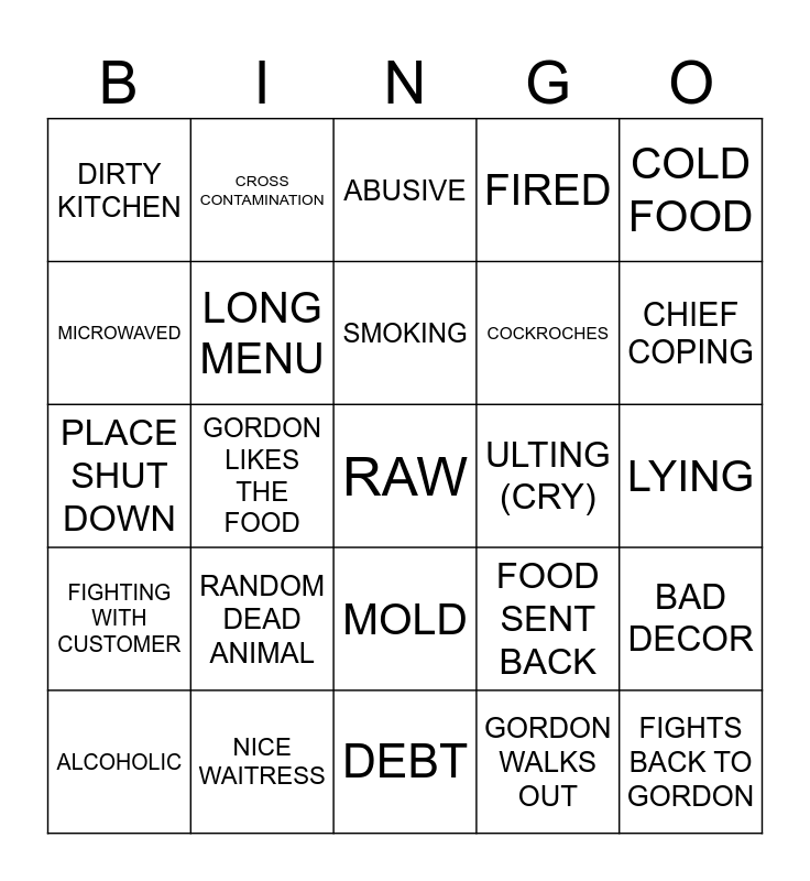 This bingo card has a free space and 24 words: RANDOM DEAD ANIMAL, NICE WAITRESS, SMOKING, ALCOHOLIC, COLD FOOD, DIRTY KITCHEN, MICROWAVED, CROSS CONTAMINATION, ULTING (CRY), MOLD, COCKROCHES, PLACE SHUT DOWN, FOOD SENT BACK, BAD DECOR, LONG MENU, GORDON WALKS OUT, LYING, ABUSIVE, CHIEF COPING, GORDON LIKES THE FOOD, FIGHTS BACK TO GORDON, FIGHTING WITH CUSTOMER, FIRED and DEBT.