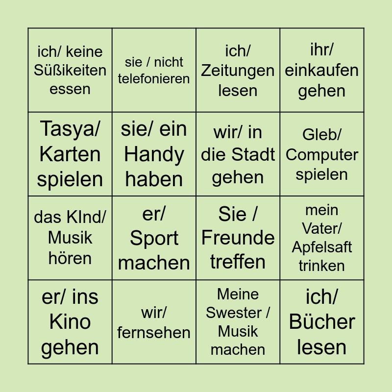 This bingo card has 16 words: er/ ins Kino gehen, wir/ fernsehen, ich/ Zeitungen lesen, ihr/ einkaufen gehen, Tasya/ Karten spielen, sie / nicht telefonieren, Sie / Freunde treffen, mein Vater/ Apfelsaft trinken, ich/ keine Süßikeiten essen, sie/ ein Handy haben, Meine Swester / Musik machen, Gleb/ Computer spielen, das KInd/ Musik hören, er/ Sport machen, wir/ in die Stadt gehen and ich/ Bücher lesen.