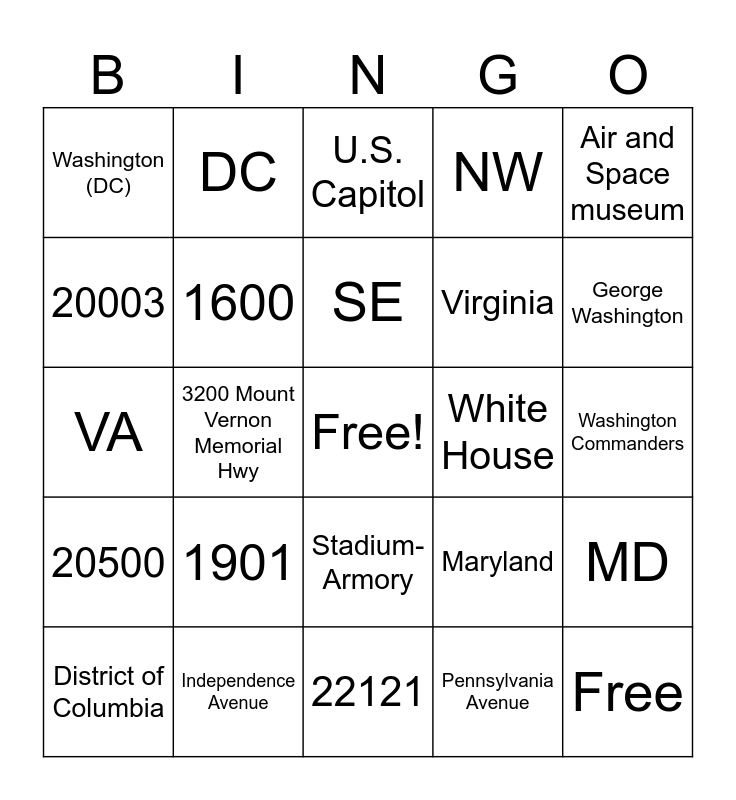 This bingo card has a free space and 24 words: 1901, Independence Avenue, SE, District of Columbia, Air and Space museum, Washington (DC), 20003, DC, White House, Stadium-Armory, Virginia, VA, Maryland, MD, 1600, Pennsylvania Avenue, Washington Commanders, U.S. Capitol, George Washington, 3200 Mount Vernon Memorial Hwy, Free, 20500, NW and 22121.
