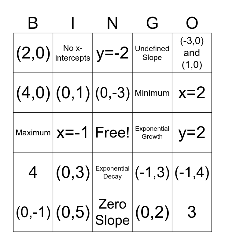 This bingo card has a free space and 24 words: (0,3), (0,5), (0,-3), (0,-1), (-3,0) and (1,0), (2,0), (4,0), No x-intercepts, Exponential Growth, Exponential Decay, Minimum, Maximum, (-1,3), (-1,4), (0,1), (0,2), y=2, y=-2, x=2, x=-1, 3, 4, Undefined Slope and Zero Slope.
