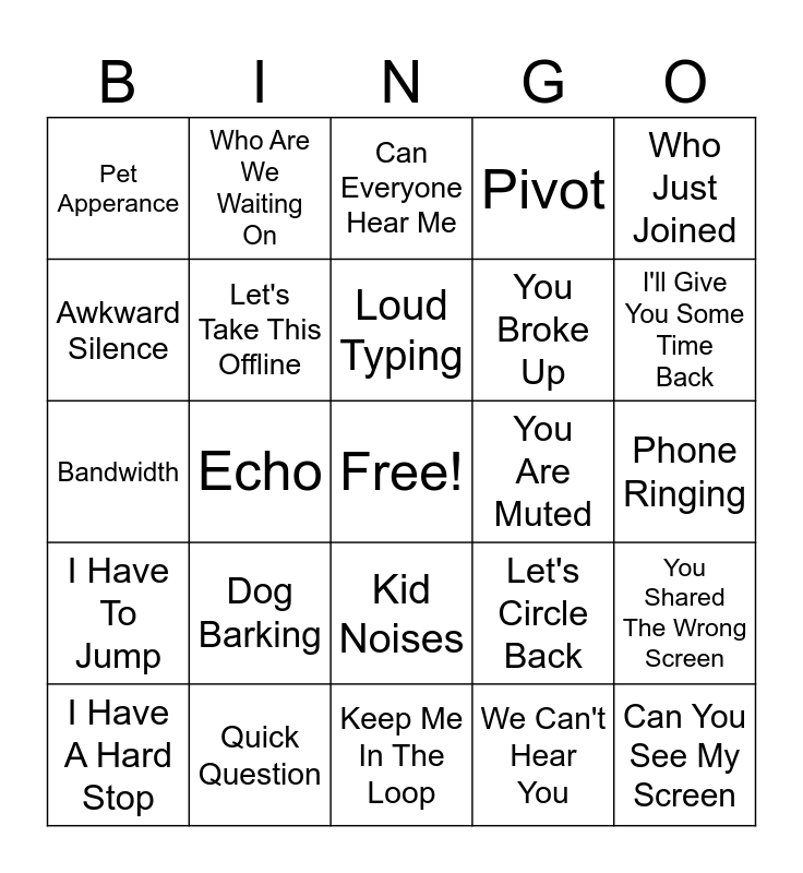 This bingo card has a free space and 24 words: Dog Barking, Quick Question, Loud Typing, I Have A Hard Stop, Who Just Joined, Pet Apperance, Awkward Silence, Who Are We Waiting On, You Are Muted, Kid Noises, You Broke Up, Bandwidth, Let's Circle Back, You Shared The Wrong Screen, Let's Take This Offline, We Can't Hear You, Phone Ringing, Can Everyone Hear Me, I'll Give You Some Time Back, Echo, Can You See My Screen, I Have To Jump, Pivot and Keep Me In The Loop.