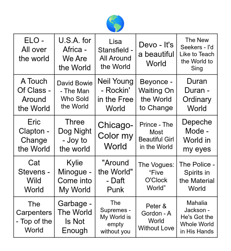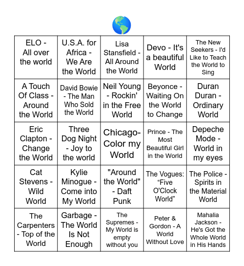 This bingo card has 34 words: Mahalia Jackson - He's Got the Whole World in His Hands, Peter & Gordon - A World Without Love, James Brown - It's a Man's Man's Man's World, Louis Armstrong - What a Wonderful World, Cat Stevens - Wild World, David Bowie - The Man Who Sold the World, The New Seekers - I'd Like to Teach the World to Sing, The Carpenters - Top of the World, U.S.A. for Africa - We Are the World, R.E.M. - It's the End of the World As We Know It, Neil Young - Rockin' in the Free World, Lisa Stansfield - All Around the World, Michael Jackson - Heal the World, Peabo Bryson & Regina Belle - A Whole New World, Prince - The Most Beautiful Girl in the World, Duran Duran - Ordinary World, Garbage - The World Is Not Enough, Eric Clapton - Change the World, Kylie Minogue - Come into My World, The Vogues: “Five O'Clock World”, "Around the World" - Daft Punk, Tears For Fears - Everybody Wants to Rule the World, ELO - All over the world, Depeche Mode - World in my eyes, The Supremes -My World is empty without you, Chicago- Color my World, Devo - It's a beautiful World, John Mayer-Waiting On the World to Change, Beyonce -Waiting On the World to Change, A Touch Of Class - Around the World, Collective Soul - The World I Know, Three Dog Night - Joy to the world, The Police - Spirits in the Material World and Kenny Chesney -Setting the world on Fire.