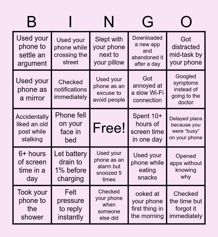 This bingo card has a free space and 32 words: ooked at your phone first thing in the morning, Checked your phone during a conversation, Phone fell on your face in bed, Lost track of time scrolling TikTok, 6+ hours of screen time in a day, Checked notifications immediately, Got distracted mid-task by your phone, Opened apps without knowing why, Used your phone while crossing the street, Watched an entire season on your phone, Used your phone as an excuse to avoid people, Slept with your phone next to your pillow, Got mad when a video wouldn’t load, Used your phone to avoid boredom, Spent 10+ hours of screen time in one day, Refreshed a page repeatedly, Took your phone to the shower, Accidentally liked an old post while stalking, Used your phone as an alarm but snoozed 5 times, Let battery drain to 1% before charging, Used your phone while eating snacks, Took a photo but never looked at it again, Delayed plans because you were “busy” on your phone, Felt pressure to reply instantly, Checked the time but forgot it immediately, Downloaded a new app and abandoned it after a day, Got annoyed at a slow Wi-Fi connection, Used your phone as a mirror, Used your phone to settle an argument, Checked your phone when someone else did, Used your phone while waiting in line and Googled symptoms instead of going to the doctor.