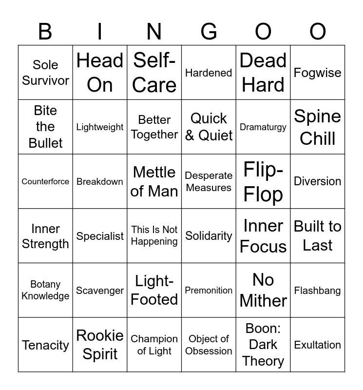 This bingo card has 150 words: Free!, Ace in the Hole, Adren, Aftercare, Alert, Any Means Necessary, Appraisal, Autodidact, Babysitter, Background Player, Balanced Landing, Bardic Inspiration, Better Together, Better than New, Bite the Bullet, Blast Mine, Blood Pact, Blood Rush, Boil Over, Bond, Boon: Circle of Healing, Boon: Dark Theory, Boon: Exponential, Boon: Illumination, Boon: Shadow Step, Borrowed Time, Botany Knowledge, Breakdown, Breakout, Buckle Up, Built to Last, Calm Spirit, Camaraderie, Champion of Light, Chemical Trap, Clairvoyance, Clean Break, Corrective Action, Counterforce, Cut Loose, Dance With Me, Dark Sense, Dead Hard, Deadline, Deception, Decisive Strike, Déjà Vu, Deliverance, Desperate Measures, Detective's Hunch, Distortion, Diversion, Dramaturgy, Empathic Connection, Empathy, Exultation, Eyes of Belmont, Fast Track, Finesse, Fixated, Flashbang, Flip-Flop, Fogwise, For the People, Friendly Competition, Hardened, Head On, Hope, Hyperfocus, Inner Focus, Inner Strength, Invocation: Treacherous Crows, Invocation: Weaving Spiders, Iron Will, Kindred, Leader, Left Behind, Light-Footed, Lightweight, Lithe, Low Profile, Lucky Break, Lucky Star, Made for This, Mettle of Man, Mirrored Illusion, Moment of Glory, No Mither, No One Left Behind, Object of Obsession, Off the Record, Open-Handed, Overcome, Overzealous, Parental Guidance, Pharmacy, Plot Twist, Plunderer's Instinct, Poised, Potential Energy, Power Struggle, Premonition, Prove Thyself, Quick & Quiet, Quick Gambit, Reactive Healing, Reassurance, Red Herring, Repressed Alliance, Residual Manifest, Resilience, Resurgence, Rookie Spirit, Saboteur, Scavenger, Scene Partner, Second Wind, Self-Care, Self-Preservation, Shoulder the Burden, Slippery Meat, Small Game, Smash Hit, Sole Survivor, Solidarity, Soul Guard, Specialist, Spine Chill, Sprint Burst, Stake Out, Still Sight, Streetwise, Strength in Shadows, Teamwork: Collective Stealth, Teamwork: Power of Two, Technician, Tenacity, This Is Not Happening, Troubleshooter, Unbreakable, Up the Ante, Urban Evasion, Vigil, Visionary, Wake Up!, We'll Make It, We're Gonna Live Forever, Wicked, Windows of Opportunity and Wiretap.