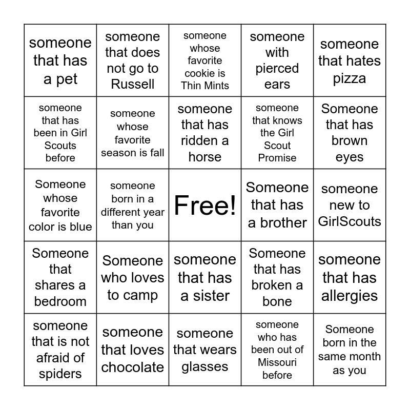 This bingo card has a free space and 24 words: Someone who loves to camp, someone that loves chocolate, someone that has ridden a horse, someone that is not afraid of spiders, someone that hates pizza, someone that has a pet, someone that has been in Girl Scouts before, someone that does not go to Russell, Someone that has a brother, someone that has a sister, someone that knows the Girl Scout Promise, Someone whose favorite color is blue, Someone that has broken a bone, someone that has allergies, someone whose favorite season is fall, someone who has been out of Missouri before, someone new to GirlScouts, someone whose favorite cookie is Thin Mints, Someone that has brown eyes, someone born in a different year than you, Someone born in the same month as you, Someone that shares a bedroom, someone with pierced ears and someone that wears glasses.
