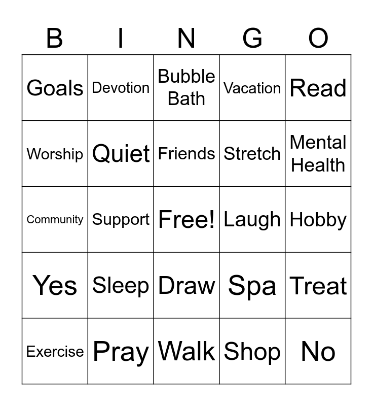 This bingo card has a free space and 24 words: Sleep, Pray, Friends, Exercise, Read, Goals, Worship, Devotion, Laugh, Draw, Stretch, Community, Spa, Treat, Quiet, Shop, Hobby, Bubble Bath, Mental Health, Support, No, Yes, Vacation and Walk.