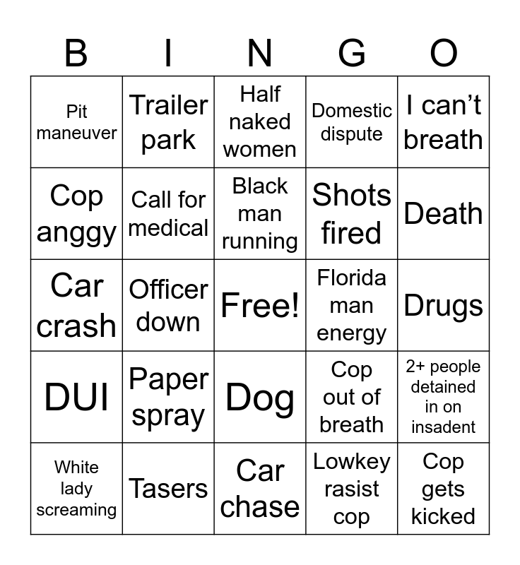 This bingo card has a free space and 24 words: Paper spray, Tasers, Black man running, White lady screaming, I can’t breath, Pit maneuver, Cop anggy, Trailer park, Florida man energy, Dog, Shots fired, Car crash, Cop out of breath, 2+ people detained in on insadent, Call for medical, Lowkey rasist cop, Drugs, Half naked women, Death, Officer down, Cop gets kicked, DUI, Domestic dispute and Car chase.