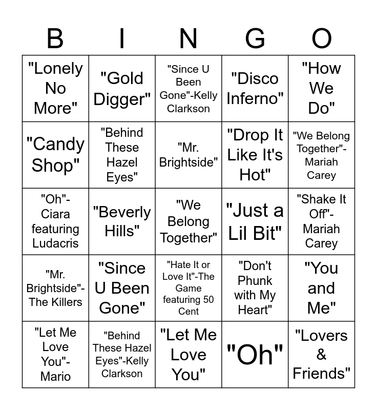 This bingo card has 51 words: Free!, "We Belong Together", "Hollaback Girl", "Let Me Love You", "Since U Been Gone", "1, 2 Step", "Gold Digger", "Boulevard of Broken Dreams", "Candy Shop", "Don't Cha", "Behind These Hazel Eyes", "Disco Inferno", "You and Me", "Don't Phunk with My Heart", "Lose Control", "Shake It Off", "Mr. Brightside", "Just a Lil Bit", "Pon de Replay", "How We Do", "Beverly Hills", "Oh", "Lonely No More", "Drop It Like It's Hot", "Hate It or Love It", "Lovers & Friends", "We Belong Together"-Mariah Carey, "Hollaback Girl"-Gwen Stefani, "Let Me Love You"-Mario, "Since U Been Gone"-Kelly Clarkson, "1, 2 Step"-Ciara featuring Missy Elliott, "Gold Digger"-Kanye West featuring Jamie Foxx, "Boulevard of Broken Dreams"-Green Day, "Candy Shop"-50 Cent featuring Olivia, "Don't Cha"-The Pussycat Dolls, "Behind These Hazel Eyes"-Kelly Clarkson, "Disco Inferno"-50 Cent, "You and Me"-Lifehouse, "Don't Phunk with My Heart"-The Black Eyed Peas, "Lose Control"-Missy Elliott, "Shake It Off"-Mariah Carey, "Mr. Brightside"-The Killers, "Just a Lil Bit"-50 Cent, "Pon de Replay"-Rihanna, "How We Do"-The Game featuring 50 Cent, "Beverly Hills"-Weezer, "Oh"-Ciara featuring Ludacris, "Lonely No More"-Rob Thomas, "Drop It Like It's Hot"-Snoop Dogg featuring Pharrell, "Hate It or Love It"-The Game featuring 50 Cent and "Lovers & Friends"-Lil Jon.
