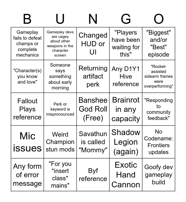 This bingo card has a free space and 29 words: Any form of error message, Freudian slips "season" instead of episode, Perk or keyword is mispronounced, "Daddy" and Immaru are used in the same sentence, Gameplay fails to defeat champs or complete mechanics, Changed HUD or UI, Someone says something about early morning, Weird Champion stun mods, Brainrot in any capacity, "For you *insert class* mains", "Responding to community feedback", Goofy dev gameplay build, Byf reference, Exotic Hand Cannon, "Rocket-assisted sidearm frames were overperforming", Something is reprised besides Court or Dreadnaught, Savathun is called "Mommy", Mic issues, "Biggest" and/or "Best" episode, Fallout Plays reference, Shadow Legion (again), Over-emphasis on one weapon type (e.g. breech-GL), Any D1Y1 Hive reference, "Character(s) you know and love", "Players have been waiting for this", Gameplay devs are cagey about other weapons in the character screen, No Codename: Frontiers updates, Returning artifact perk and No updates to Guardian Games.
