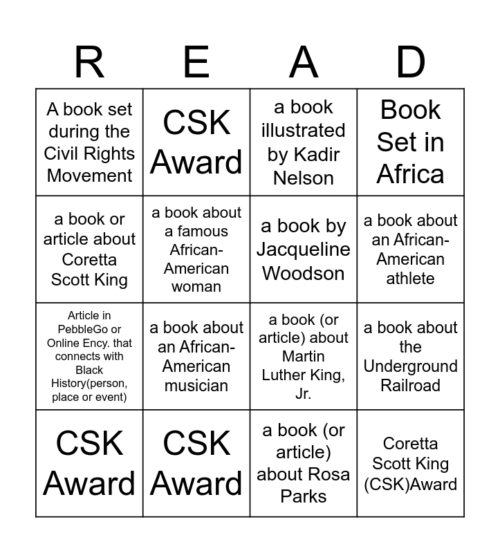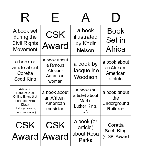 This bingo card has 16 words: CSK Award, a book about the Underground Railroad, a book illustrated by Kadir Nelson, A book set during the Civil Rights Movement, Article in PebbleGo or Online Ency. that connects with Black History(person, place or event), CSK Award, a book (or article) about Martin Luther King, Jr., a book (or article) about Rosa Parks, a book or article about Coretta Scott King, a book about a famous African-American woman, CSK Award, Book Set in Africa, a book about an African-American musician, a book about an African-American athlete, a book by Jacqueline Woodson and Coretta Scott King (CSK)Award.