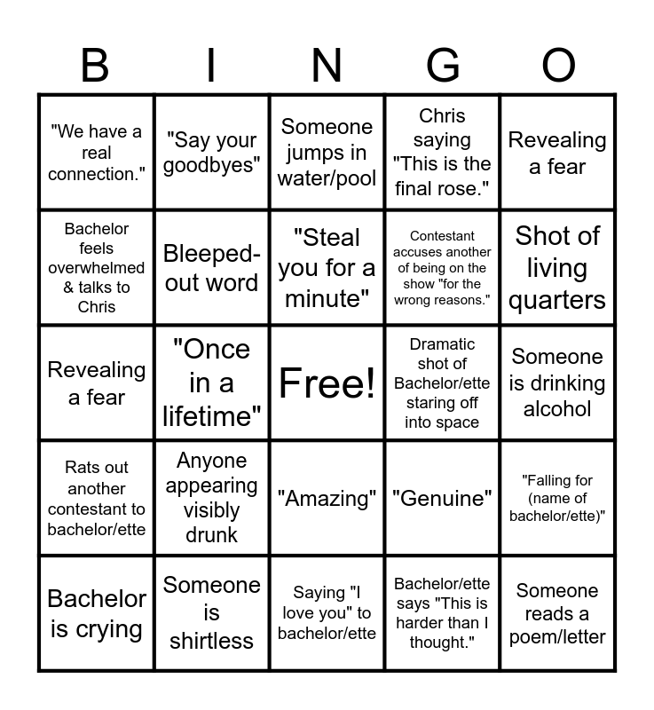 This bingo card has a free space and 24 words: Anyone appearing visibly drunk, Someone is shirtless, "Steal you for a minute", Bachelor is crying, Revealing a fear, "We have a real connection.", Bachelor feels overwhelmed & talks to Chris, "Say your goodbyes", Dramatic shot of Bachelor/ette staring off into space, "Amazing", Contestant accuses another of being on the show "for the wrong reasons.", Revealing a fear, "Genuine", "Falling for (name of bachelor/ette)", Bleeped-out word, Bachelor/ette says "This is harder than I thought.", Someone is drinking alcohol, Someone jumps in water/pool, Shot of living quarters, "Once in a lifetime", Someone reads a poem/letter, Rats out another contestant to bachelor/ette, Chris saying "This is the final rose." and Saying "I love you" to bachelor/ette.