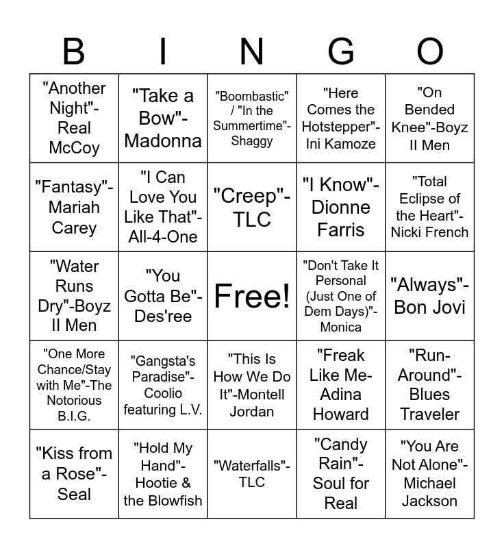 This bingo card has a free space and 25 words: "Gangsta's Paradise"-Coolio featuring L.V., "Waterfalls"-TLC, "Creep"-TLC, "Kiss from a Rose"-Seal, "On Bended Knee"-Boyz II Men, "Another Night"-Real McCoy, "Fantasy"-Mariah Carey, "Take a Bow"-Madonna, "Don't Take It Personal (Just One of Dem Days)"-Monica, "This Is How We Do It"-Montell Jordan, "I Know"-Dionne Farris, "Water Runs Dry"-Boyz II Men, "Freak Like Me-Adina Howard, "Run-Around"-Blues Traveler, "I Can Love You Like That"-All-4-One, "Have You Ever Really Loved a Woman?"-Bryan Adams, "Always"-Bon Jovi, "Boombastic" / "In the Summertime"-Shaggy, "Total Eclipse of the Heart"-Nicki French, "You Gotta Be"-Des'ree, "You Are Not Alone"-Michael Jackson, "Hold My Hand"-Hootie & the Blowfish, "One More Chance/Stay with Me"-The Notorious B.I.G., "Here Comes the Hotstepper"-Ini Kamoze and "Candy Rain"-Soul for Real.