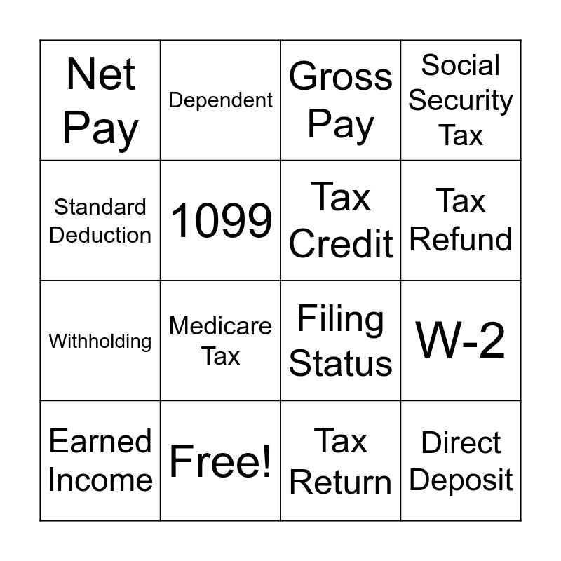 This bingo card has 16 words: Free!, W-2, Gross Pay, Net Pay, Withholding, Dependent, Filing Status, Tax Return, Standard Deduction, 1099, Earned Income, Social Security Tax, Medicare Tax, Tax Refund, Tax Credit and Direct Deposit.
