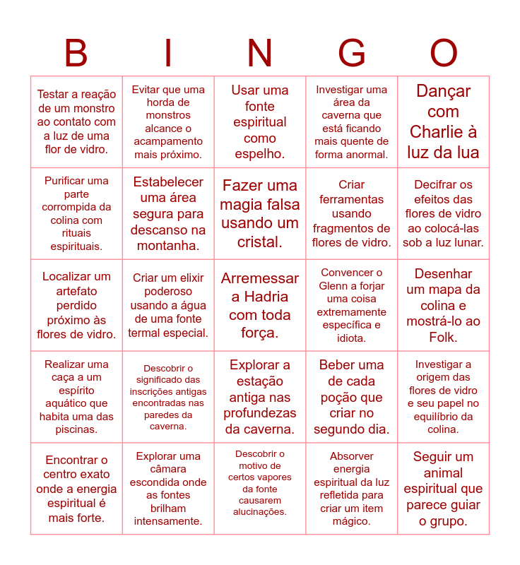 This bingo card has 25 words: Descobrir o significado das inscrições antigas encontradas nas paredes da caverna., Descobrir o motivo de certos vapores da fonte causarem alucinações., Fazer uma magia falsa usando um cristal., Encontrar o centro exato onde a energia espiritual é mais forte., Dançar com Charlie à luz da lua, Testar a reação de um monstro ao contato com a luz de uma flor de vidro., Purificar uma parte corrompida da colina com rituais espirituais., Evitar que uma horda de monstros alcance o acampamento mais próximo., Convencer o Glenn a forjar uma coisa extremamente específica e idiota., Explorar a estação antiga nas profundezas da caverna., Criar ferramentas usando fragmentos de flores de vidro., Localizar um artefato perdido próximo às flores de vidro., Beber uma de cada poção que criar no segundo dia., Investigar a origem das flores de vidro e seu papel no equilíbrio da colina., Estabelecer uma área segura para descanso na montanha., Seguir um animal espiritual que parece guiar o grupo., Desenhar um mapa da colina e mostrá-lo ao Folk., Usar uma fonte espiritual como espelho., Decifrar os efeitos das flores de vidro ao colocá-las sob a luz lunar., Criar um elixir poderoso usando a água de uma fonte termal especial., Arremessar a Hadria com toda força., Explorar uma câmara escondida onde as fontes brilham intensamente., Realizar uma caça a um espírito aquático que habita uma das piscinas., Investigar uma área da caverna que está ficando mais quente de forma anormal. and Absorver energia espiritual da luz refletida para criar um item mágico..