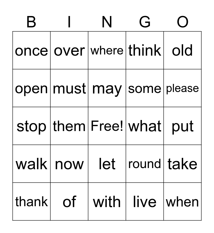 This bingo card has a free space and 26 words: let, live, may, of, old, once, open, over, put, round, some, stop, take, thank, them, then, think, walk, where, when, please, with, what, now, must and pretty.