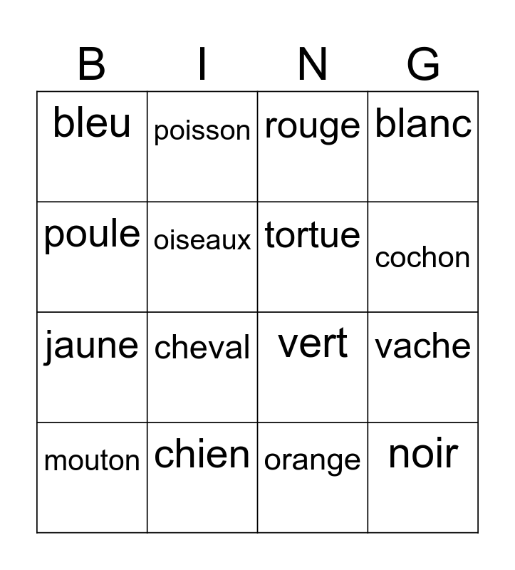 This bingo card has 22 words: chien, chat, poisson, lapin, oiseaux, tortue, bleu, rouge, vert, noir, jaune, blanc, brun, rose, orange, mauve, vache, mouton, cheval, poule, cochon and chevre.
