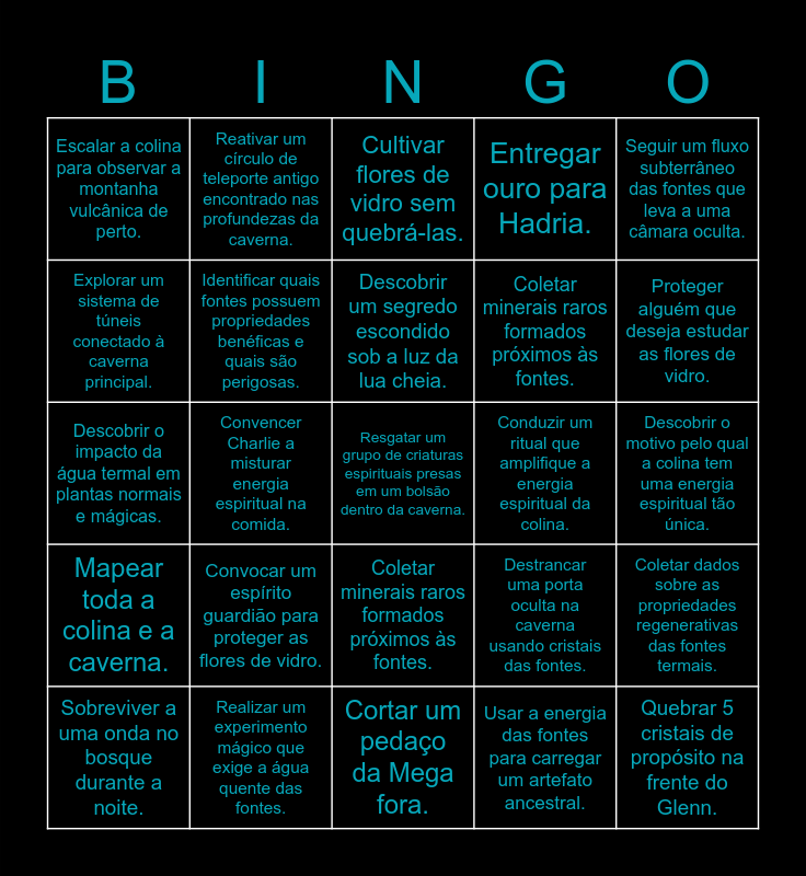 This bingo card has a free space and 24 words: Convocar um espírito guardião para proteger as flores de vidro., Realizar um experimento mágico que exige a água quente das fontes., Descobrir um segredo escondido sob a luz da lua cheia., Sobreviver a uma onda no bosque durante a noite., Seguir um fluxo subterrâneo das fontes que leva a uma câmara oculta., Escalar a colina para observar a montanha vulcânica de perto., Explorar um sistema de túneis conectado à caverna principal., Reativar um círculo de teleporte antigo encontrado nas profundezas da caverna., Conduzir um ritual que amplifique a energia espiritual da colina., Coletar minerais raros formados próximos às fontes., Coletar minerais raros formados próximos às fontes., Descobrir o impacto da água termal em plantas normais e mágicas., Destrancar uma porta oculta na caverna usando cristais das fontes., Coletar dados sobre as propriedades regenerativas das fontes termais., Identificar quais fontes possuem propriedades benéficas e quais são perigosas., Usar a energia das fontes para carregar um artefato ancestral., Descobrir o motivo pelo qual a colina tem uma energia espiritual tão única., Cultivar flores de vidro sem quebrá-las., Proteger alguém que deseja estudar as flores de vidro., Convencer Charlie a misturar energia espiritual na comida., Quebrar 5 cristais de propósito na frente do Glenn., Mapear toda a colina e a caverna., Entregar ouro para Hadria. and Cortar um pedaço da Mega fora..