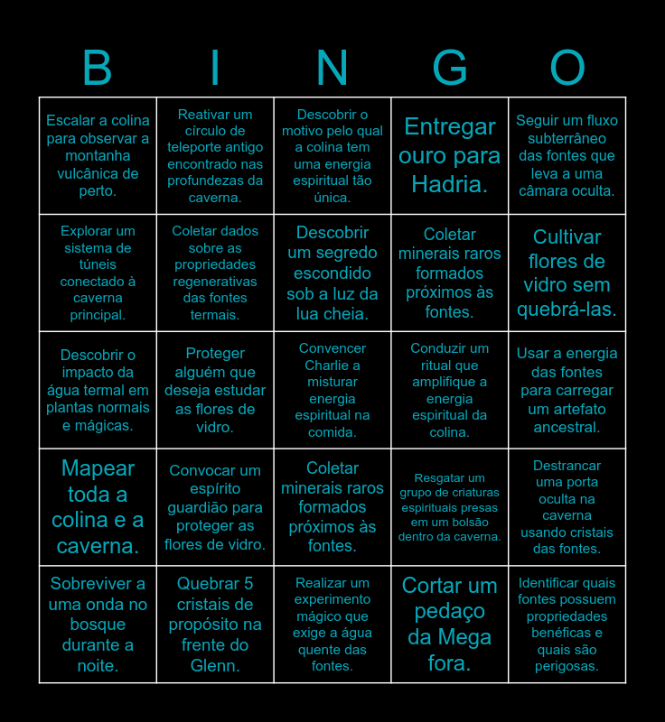 This bingo card has 25 words: Convocar um espírito guardião para proteger as flores de vidro., Realizar um experimento mágico que exige a água quente das fontes., Descobrir um segredo escondido sob a luz da lua cheia., Sobreviver a uma onda no bosque durante a noite., Seguir um fluxo subterrâneo das fontes que leva a uma câmara oculta., Escalar a colina para observar a montanha vulcânica de perto., Explorar um sistema de túneis conectado à caverna principal., Reativar um círculo de teleporte antigo encontrado nas profundezas da caverna., Conduzir um ritual que amplifique a energia espiritual da colina., Coletar minerais raros formados próximos às fontes., Coletar minerais raros formados próximos às fontes., Descobrir o impacto da água termal em plantas normais e mágicas., Resgatar um grupo de criaturas espirituais presas em um bolsão dentro da caverna., Destrancar uma porta oculta na caverna usando cristais das fontes., Coletar dados sobre as propriedades regenerativas das fontes termais., Identificar quais fontes possuem propriedades benéficas e quais são perigosas., Usar a energia das fontes para carregar um artefato ancestral., Descobrir o motivo pelo qual a colina tem uma energia espiritual tão única., Cultivar flores de vidro sem quebrá-las., Proteger alguém que deseja estudar as flores de vidro., Convencer Charlie a misturar energia espiritual na comida., Quebrar 5 cristais de propósito na frente do Glenn., Mapear toda a colina e a caverna., Entregar ouro para Hadria. and Cortar um pedaço da Mega fora..