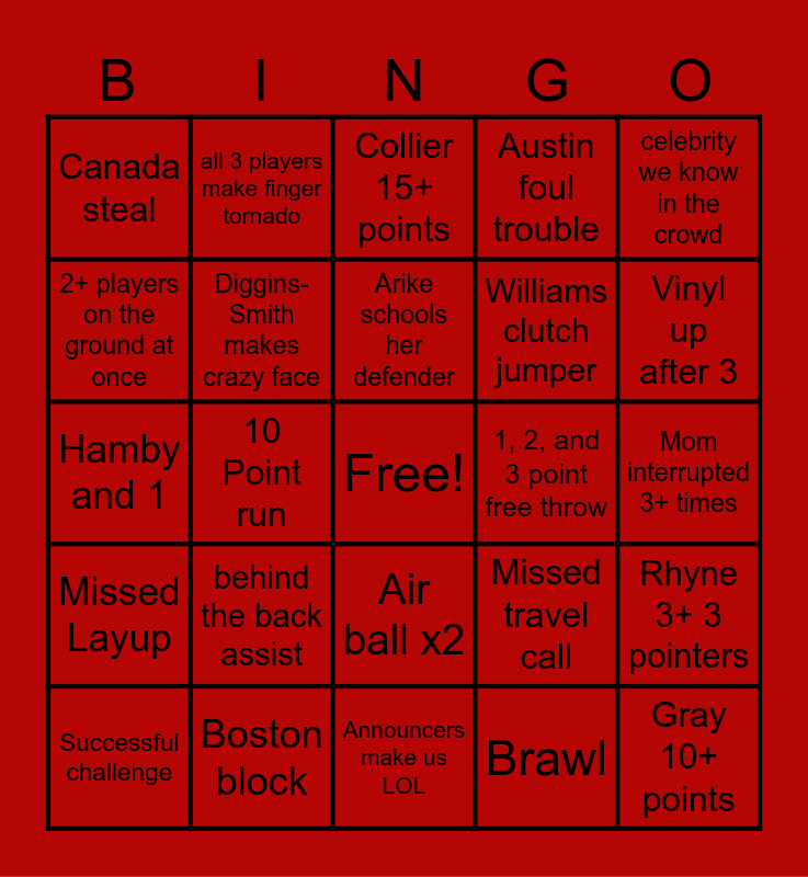 This bingo card has a free space and 24 words: behind the back assist, Boston block, Arike schools her defender, Successful challenge, celebrity we know in the crowd, Canada steal, 2+ players on the ground at once, all 3 players make finger tornado, 1, 2, and 3 point free throw, Air ball x2, Williams clutch jumper, Hamby and 1, Missed travel call, Rhyne 3+ 3 pointers, Diggins-Smith makes crazy face, Brawl, Mom interrupted 3+ times, Collier 15+ points, Vinyl up after 3, 10 Point run, Gray 10+ points, Missed Layup, Austin foul trouble and Announcers make us LOL.
