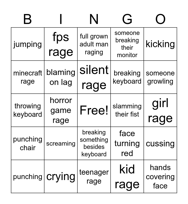 This bingo card has a free space and 24 words: screaming, crying, silent rage, punching, kicking, jumping, minecraft rage, fps rage, slamming their fist, breaking something besides keyboard, breaking keyboard, throwing keyboard, face turning red, cussing, blaming on lag, kid rage, girl rage, full grown adult man raging, someone growling, horror game rage, hands covering face, punching chair, someone breaking their monitor and teenager rage.